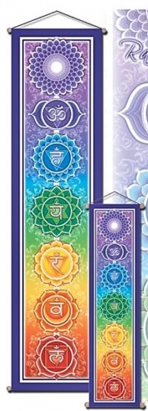 Este bello banner con representación de los 7 chakras está impreso en poliester.Es ideal para interior o exterios. Tiene una madera decorativa en la parte inferior y superior.