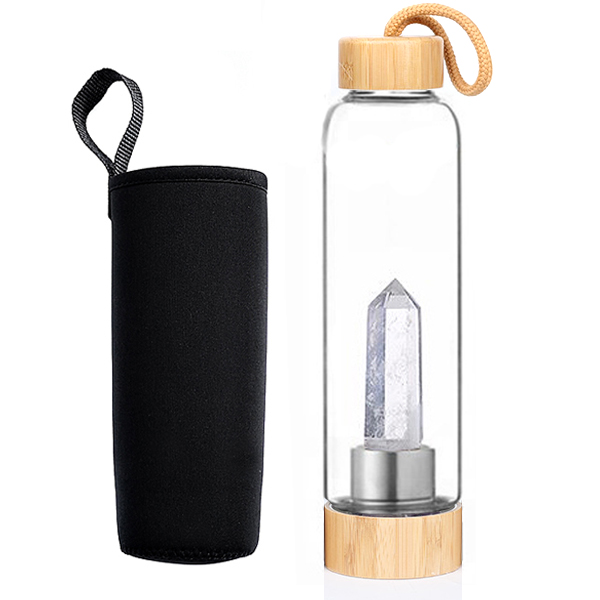 Botella de vidrio con una punta de Cristal de Roca en su interior bien sujeta a la base. Tapón de rosca de acero con un enganche para ser colgada. La botella se sirve con una funda protectora de neopreno. Tamaño botella: 240x60mm Tamaño mineral: 85x20mm aprox. Capacidad: 500ml Introduce agua, infusión o cualquier líquido en la botella que entrará en contacto directo con el mineral.