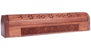 Caja para quemar varillas y 2 conos de incienso. Fabricada en madera Decorado con pentáculo Tamaño 31x5.5x6 cm