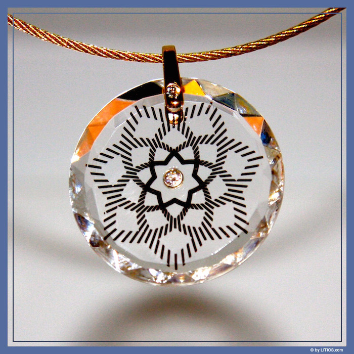 Material: Cristal de alta calidad con finísimo pulido. Con ojal para llevar con cadena o cordón. Con Iniciación y Energía Cristalina.