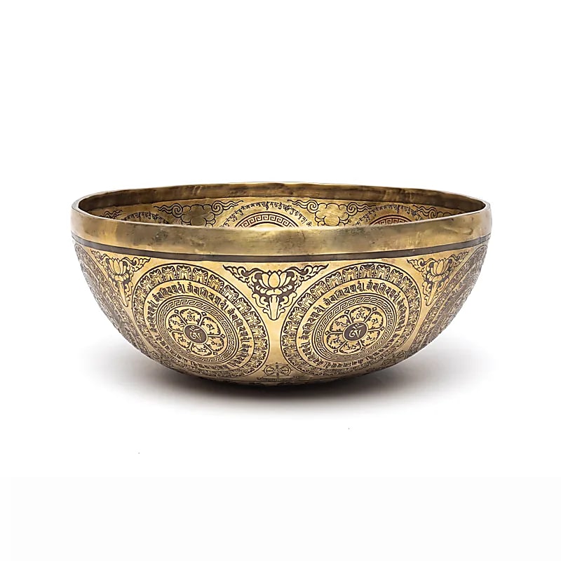 Cuenco tibetano artesanal grabado, elaborado a partir de una aleación de bronce con trazas de metales nobles (como Ag, Ni, Cd, Ru, Pd, Pt, Cr y Mn), grabado con láser y pintado a mano.