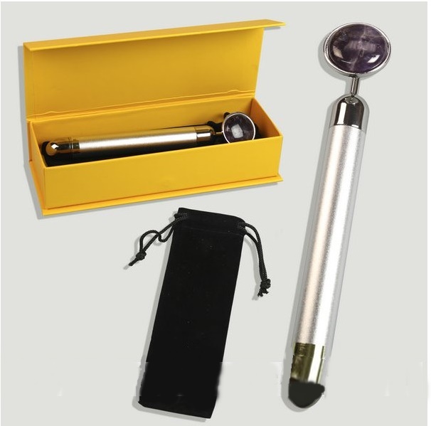 Masajeador facial vibratorio. (Activa la microcirculación, mejorando la efectividad de las cremas) Mineral: amatista Tamaño aproximado: 15,50cm. Funciona con pila AA. (NO INCLUÍDA). Presentación en caja con bolsita para guardar, folleto informativo de la piedra y manual de usuario con imágenes explicativas para su utilización.