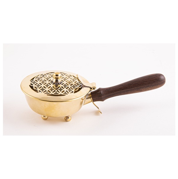 Incensario portador Flor de la Vida Con una Flor de la Vida perforada en la tapa. Tu incienso se acompaña e intensifica con el poder de manifestación y la protección de la flor de la vida. Quemador de incienso con mango de madera Estos recipientes son especialmente adecuados para limpiar habitaciones y aura. El asa larga de madera los hace fáciles de transportar . Vaya de una habitación a otra con ligeros movimientos giratorios y ahuma con cuidado las esquinas. Con la limpieza del aura, uno debe a rodear a la persona con leves movimientos giratorios de abajo hacia arriba y avivando las columnas de humo hacia él o ella. Latón con mango de madera. Alto: 7 cm, largo: 20 cm, ø 9 cm