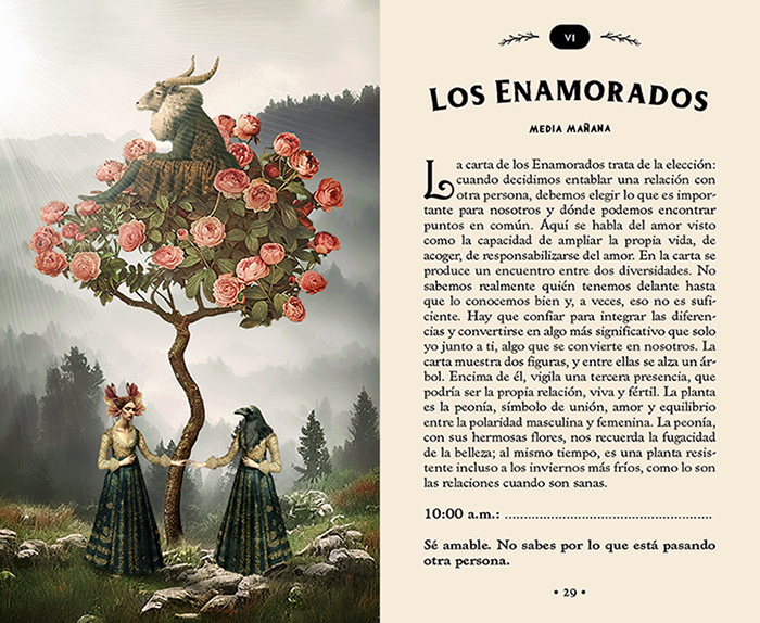 Un viaje a través del tiempo, el espacio y los sueños en busca de la magia oculta del bosque. En el bosque, el tiempo es variable y mágico. A cada hora, la luz cambia, al igual que los colores y las sensaciones, a un ritmo natural y ancestral que separa las estaciones. En esta baraja, podrás seguir el viaje del sol y la luna a lo largo del día y la noche. Conocerás criaturas fantásticas y cotidianas, guardianes del amanecer, del crepúsculo, de la noche profunda y de la luna que brilla en la di...