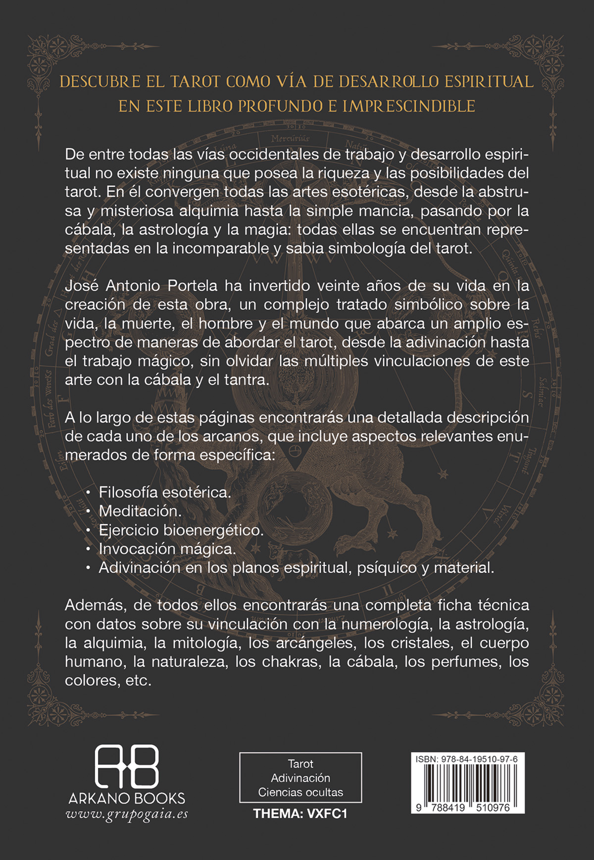 José Antonio Portela ha invertido veinte años de su vida en la creación de esta obra, un complejo tratado simbólico sobre la vida, la muerte, el hombre y el mundo que abarca un amplio espectro de maneras de abordar el tarot, desde la adivinación hasta el trabajo mágico, sin olvidar las múltiples vinculaciones de este arte con la cábala y el tantra.