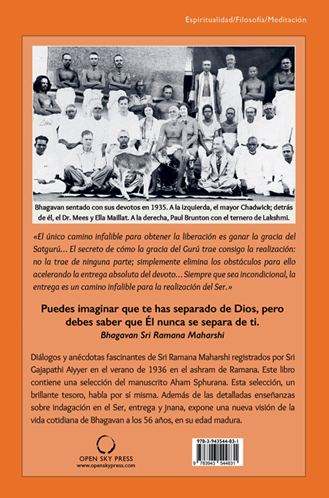 Queremos animar al lector a que se abra a una aventura en el silencio, a una nueva perspectiva de la vida cotidiana de Bhagavan y a su propia y profunda transformación interior a través de estas detalladas enseñanzas sobre la indagación en el Ser, la entrega y jnana. Esta selección de enseñanzas es un tesoro para todos los devotos de Bhagavan.