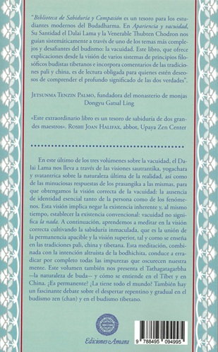 En este último de los tres volúmenes sobre la vacuidad, el Dalai Lama nos lleva a través de las visiones sautrantika, yogachara y svatantrica sobre la naturaleza última de la realidad, así como de las minuciosas respuestas de los prasangika a las mismas, para que obtengamos la visión correcta de la vacuidad: la ausencia de identidad esencial tanto de la persona como de los fenómenos. Esta visión implica negar la existencia convencional: vacuidad no significa la nada. A continuación, aprendemos a meditar en la visión correcta cultivando la sabiduría inmaculada, que es la unión de la permanencia apacible y la visión uperior, tal y cono se enseña en las tradiciones pali, china y tibetana. Esta meditación, combinada con la intención altruista de la bodhichita, conduce a erradicar por completo todas las impurezas que oscurecen nuestra mente. Este volumen también nos presenta el Tathagatagarbha-la naturaleza de buda- y cómo se entiende en el Tíbet y en China. ¿Es permanente? ¿La tiene todo el mundo? También hay un fascinante debate sobre el despertar repentino y gradual en el budismo zen (chan) y en el budismo tibetano.