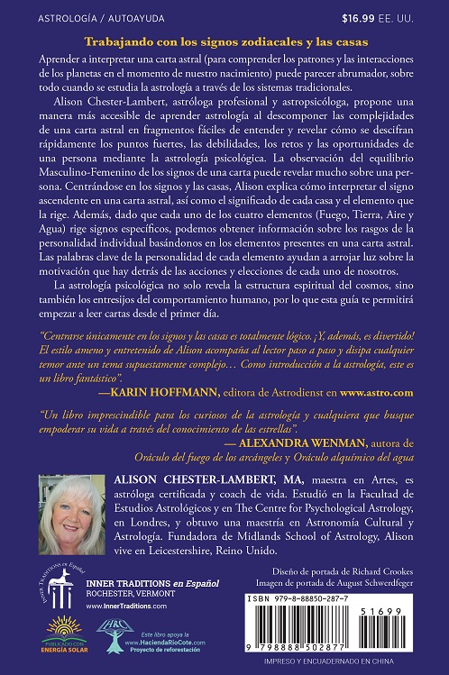 • Incluye ejemplos de cartas e interpretaciones para guiarte en tus primeros pasos en la astrología. Aprender a interpretar una carta astral (para comprender los patrones y las interacciones de los planetas en el momento de nuestro nacimiento) puede parecer abrumador, sobre todo cuando se estudia la astrología a través de los sistemas tradicionales. Alison Chester-Lambert, astróloga profesional y astropsicóloga, propone una manera más accesible de aprender astrología al descomponer las complejidades de una carta astral en fragmentos fáciles de entender y revelar cómo se descifran rápidamente los puntos fuertes, las debilidades, los retos y las oportunidades de una persona mediante la astrología psicológica. La observación del equilibrio Masculino-Femenino de los signos de una carta puede revelar mucho sobre una persona. Centrándose en los signos y las casas, Alison explica cómo interpretar el signo ascendente en una carta astral, así como el significado de cada casa y el elemento que la rige. Además, dado que cada uno de los cuatro elementos (Fuego, Tierra, Aire y Agua) rige signos específicos, podemos obtener información sobre los rasgos de la personalidad individual basándonos en los elementos presentes en una carta astral. Las palabras clave de la personalidad de cada elemento ayudan a arrojar luz sobre la motivación que hay detrás de las acciones y elecciones de cada uno de nosotros. La astrología psicológica no solo revela la estructura espiritual del cosmos, sino también los entresijos del comportamiento humano, por lo que esta guía te permitirá empezar a leer cartas desde el primer día.