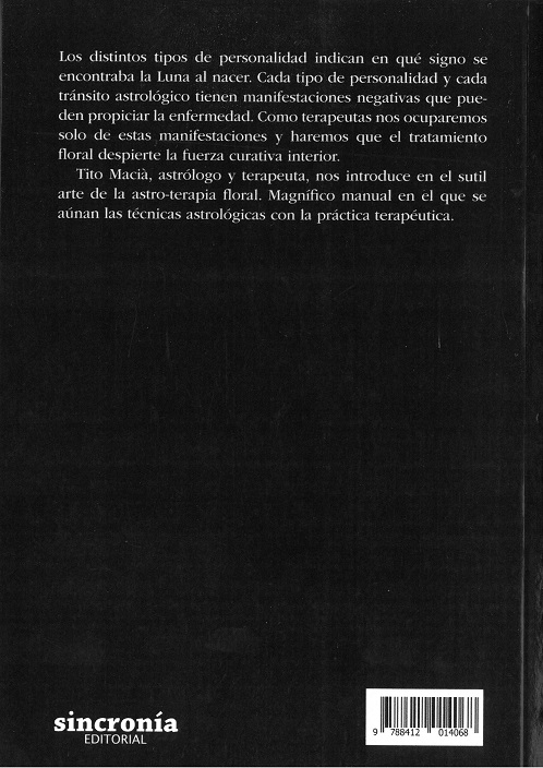 Tito Maciá, astrólogo y terape8ura, nos introduce en el sutil arte de la astro-terapia floral. Magnífico manual en el que se aúnan las técnicas astrológicas con la práctica terapéutica.