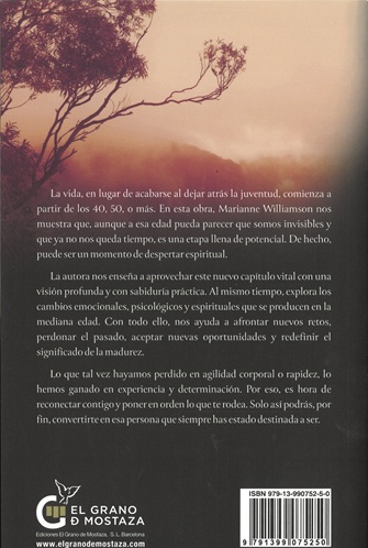En esta obra Marianne Williamson nos muestra que la vida, en lugar de acabarse al dejar atrás la juventud, comienza a partir de los 40, 50, o más. Nos enseña a aprovechar este nuevo capítulo vital con una visión profunda y con sabiduría práctica, al tiempo que explora los cambios emocionales, psicológicos y espirituales que se producen en la mediana edad para ayudarnos a afrontar nuevos retos, perdonar el pasado, aceptar nuevas oportunidades y redefinir el significado de la madurez.