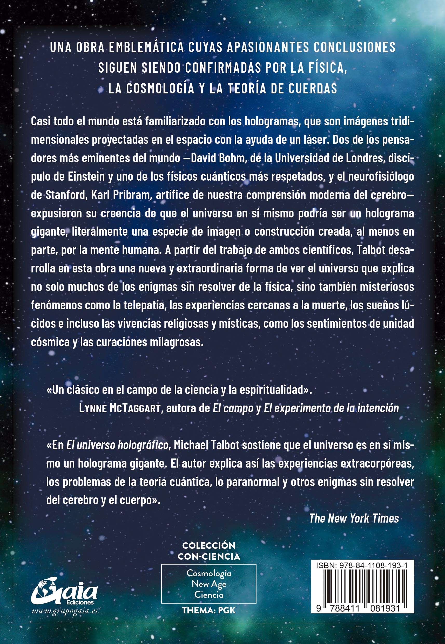 Casi todo el mundo está familiarizado con los hologramas, que son imágenes tridimensionales proyectadas en el espacio con la ayuda de un láser. Dos de los pensadores más eminentes del mundo —David Bohm, de la Universidad de Londres, discípulo de Einstein y uno de los físicos cuánticos más respetados, y el neurofisiólogo de Stanford, Karl Pribram, artífice de nuestra comprensión moderna del cerebro— expusieron su creencia de que el universo en sí mismo podría ser un holograma gigante, literalmente una especie de imagen o construcción creada, al menos en parte, por la mente humana. A partir del trabajo de ambos científicos, Talbot desarrolla en esta obra una nueva y extraordinaria forma de ver el universo que explica no solo muchos de los enigmas sin resolver de la física, sino también misteriosos fenómenos como la telepatía, las experiencias cercanas a la muerte, los sueños lúcidos e incluso las vivencias religiosas y místicas, como los sentimientos de unidad cósmica y las curaciones milagrosas.