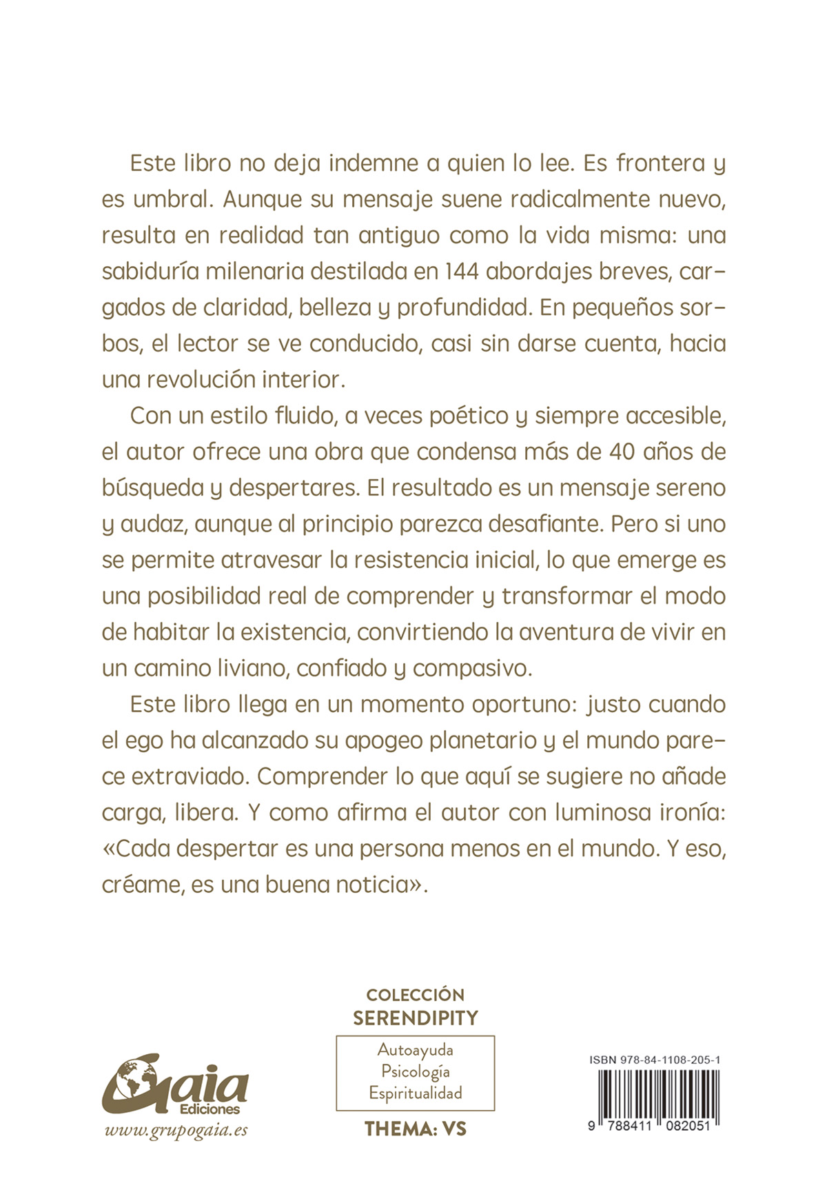 Este libro llega en un momento oportuno: justo cuando el ego ha alcanzado su apogeo planetario y el mundo parece extraviado. Comprender lo que aquí se sugiere no añade carga, libera. Y como afirma el autor con luminosa ironía: «Cada despertar es una persona menos en el mundo. Y eso, créame, es una buena noticia».