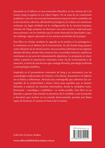 Eucaristía en el infierno es una inmersión filosófica en las visiones de Carl Gustav Jung recogidas en Los Libros Negros. No se trata de un comentario académico, sino de una travesía hermenéutica hacia el núcleo simbólico de lo inconsciente colectivo, allí donde lo primigenio, lo ctónico y lo numinoso reclaman un lugar olvidado en la configuración de la vivencia humana. Antonio de Diego propone un descenso a la cueva oscura y matricial para reencontrarse con los símbolos que la razón ilustrada ha desechado y que, sin embargo, siguen operando en los estratos profundos de la psique.
