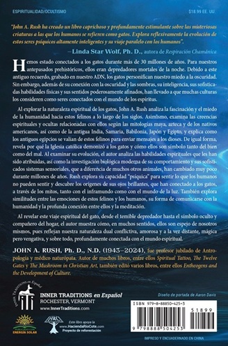 Al explorar la naturaleza espiritual de los gatos, John A. Rush analiza la fascinación y el miedo de la humanidad hacia estos felinos a lo largo de los siglos. Asimismo, examina las creencias espirituales y ocultas relacionadas con ellos según las mitologías maya, azteca y de los nativos americanos, así como de la antigua India, Samaria, Babilonia, Japón y Egipto, y explica como los antiguos egipcios se valían de estos felinos para enviar mensajes a los dioses. De igual forma, revela por qué la Iglesia católica demonizó a los gatos y cómo ellos son símbolo tanto del bien como del mal. Al examinar su evolución, el autor analiza las habilidades espirituales que les han sido atribuidas, así como la investigación biológica moderna de su comportamiento y sus sofisticados sistemas sensoriales, que, a diferencia de muchos otros animales, han cambiado muy poco durante millones de años. Rush explora su capacidad “psíquica” para sentir lo que los humanos no pueden sentir y descubre los orígenes de sus ojos brillantes,