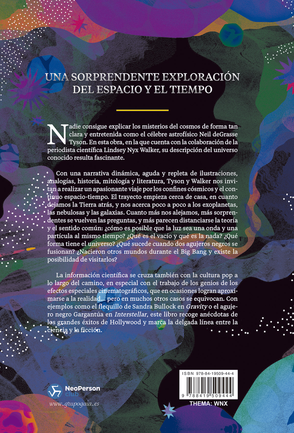 Con una narrativa dinámica, aguda y repleta de ilustraciones, analogías, historia, mitología y literatura, Tyson y Walker nos invitan a realizar un apasionante viaje por los confines cósmicos y el continuo espacio-tiempo. El trayecto empieza cerca de casa, en cuanto dejamos la Tierra atrás, y nos acerca poco a poco a los exoplanetas, las nebulosas y las galaxias. Cuanto más nos alejamos, más sorprendentes se vuelven las preguntas, y más parecen distanciarse la teoría y el sentido común: ¿cómo es posible que la luz sea una onda y una partícula al mismo tiempo? ¿Qué es el vacío y qué es la nada? ¿Qué forma tiene el universo? ¿Qué sucede cuando dos agujeros negros se fusionan? ¿Nacieron otros mundos durante el Big Bang y existe la posibilidad de visitarlos?