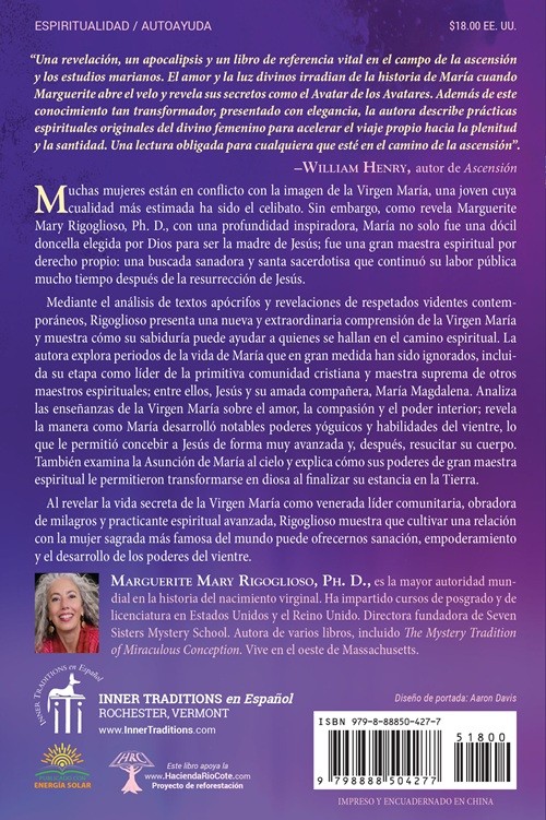 Mediante el análisis de textos apócrifos y revelaciones de respetados videntes contemporáneos, Rigoglioso presenta una nueva y extraordinaria comprensión de la Virgen María y muestra cómo su sabiduría puede ayudar a quienes se hallan en el camino espiritual. La autora explora periodos de la vida de María que en gran medida han sido ignorados, incluida su etapa como líder de la primitiva comunidad cristiana y maestra suprema de otros maestros espirituales; entre ellos, Jesús y su amada compañera, María Magdalena. Analiza las enseñanzas de la Virgen María sobre el amor, la compasión y el poder interior; revela la manera como María desarrolló notables poderes yóguicos y habilidades del vientre, lo que le permitió concebir a Jesús de forma muy avanzada y, después, resucitar su cuerpo. También examina la Asunción de María al cielo y explica cómo sus poderes de gran maestra espiritual le permitieron transformarse en diosa al finalizar su estancia en la Tierra.