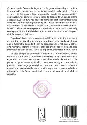 Esta obra compilatoria de mis nuevas experiencias y ampliación de conocimientos tiene como base mis anteriores obras “Lenguaje de Luz” y “El Despertar” fusionándolos con mis últimos encuentros con la Geometría Sagrada en Empúries o la Energía Telúrica en el Parque megalítico de Roses y otros puntos de energía de los que cito características, naciendo de esta forma una bella trilogía que hoy comparto aquí. Expongo exhaustivamente los orígenes conocidos y significado en las antiguas civilizaciones de la flor de la vida historia y esencia de la Geometría Sagrada, su simbología en distintos lugares del mundo y su utilización para poder despertar en nosotros este poder ancestral.Conocimiento de origen incluso anterior a la glaciación en la era de los gigantes, y civilizaciones más avanzadas en el conocimiento de nuestro poder interior, celular y energético. Las antiguas civilizaciones utilizaron estos códigos geométricos en su cultura, lo que demuestra que se trata de una sabiduría ancestral que siempre ha existido aunque haya permanecido de forma oculta y secreta.-Facilito un estudio sobre la Flor de la vida, solidos platónicos, el cubo Metatrón, Vector en Equilibrium, IHS, I Ching, Vector en Equilibrium, el toroide, el Número de oro, la estrella Tetraédrica, la cábala, Domos Geómétricos o como proteger, limpiar y purificar lugares con la Geometría Sagrada. -Descubriremos lugares mágicos, mosaicos geométricos, patrones energéticos.-Practicaremos ejercicios y meditaciones con esta técnica sagrada.