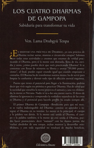 El primer Dharma de Gampopa -Bendíceme para mi mente se vuelva indistinguible del Dharma- consiste en aprender a integrar el Dharma en tu interior. La mente es lo principal, el cuerpo y la palabra van detrás. Si la mente está unida al Dharma, el cuerpo y la palabra también; si la mente no está unida al Dharma, puedes hacer postraciones, decir “namasté” con las manos juntas, dar vueltas alrededor de una estupa, recitar mantras y desarrollar mindfulness, y con toda seguridad no resultará de mucho beneficio.
