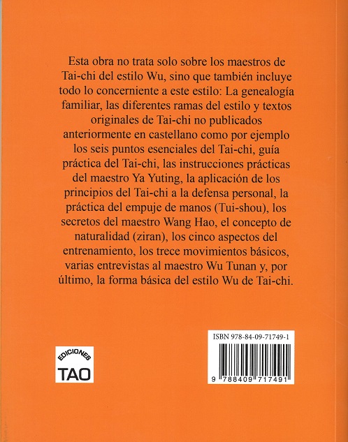 Esta obra no trata solo sobre los maestros de Tai-chi del estilo Wu, sino que también incluye todo lo concerniente a este estilo: La genealogía familiar, las diferentes ramas del estilo y textos originales de Tai-chi no publicados anteriormente en castellano como por ejemplo los seis puntos esenciales del Tai-chi, guía práctica del Tai-chi, las instrucciones prácticas del maestro Ya Yuting….